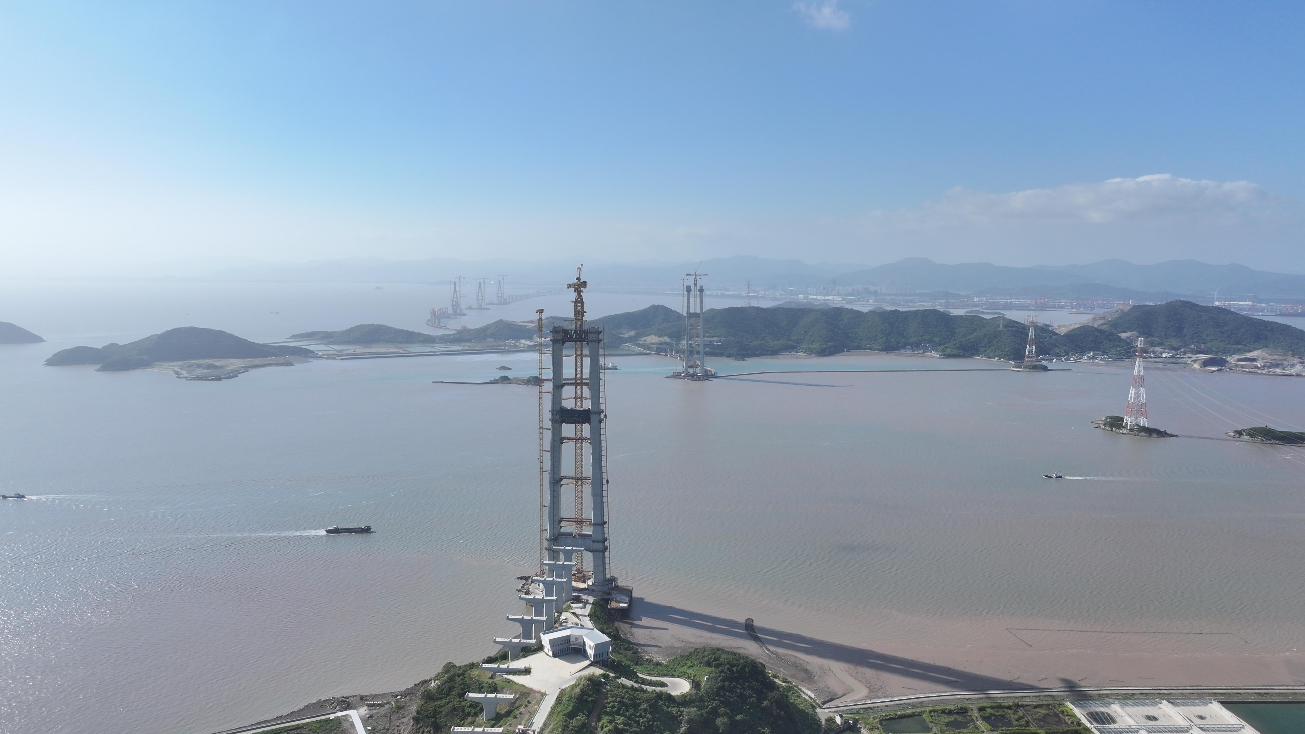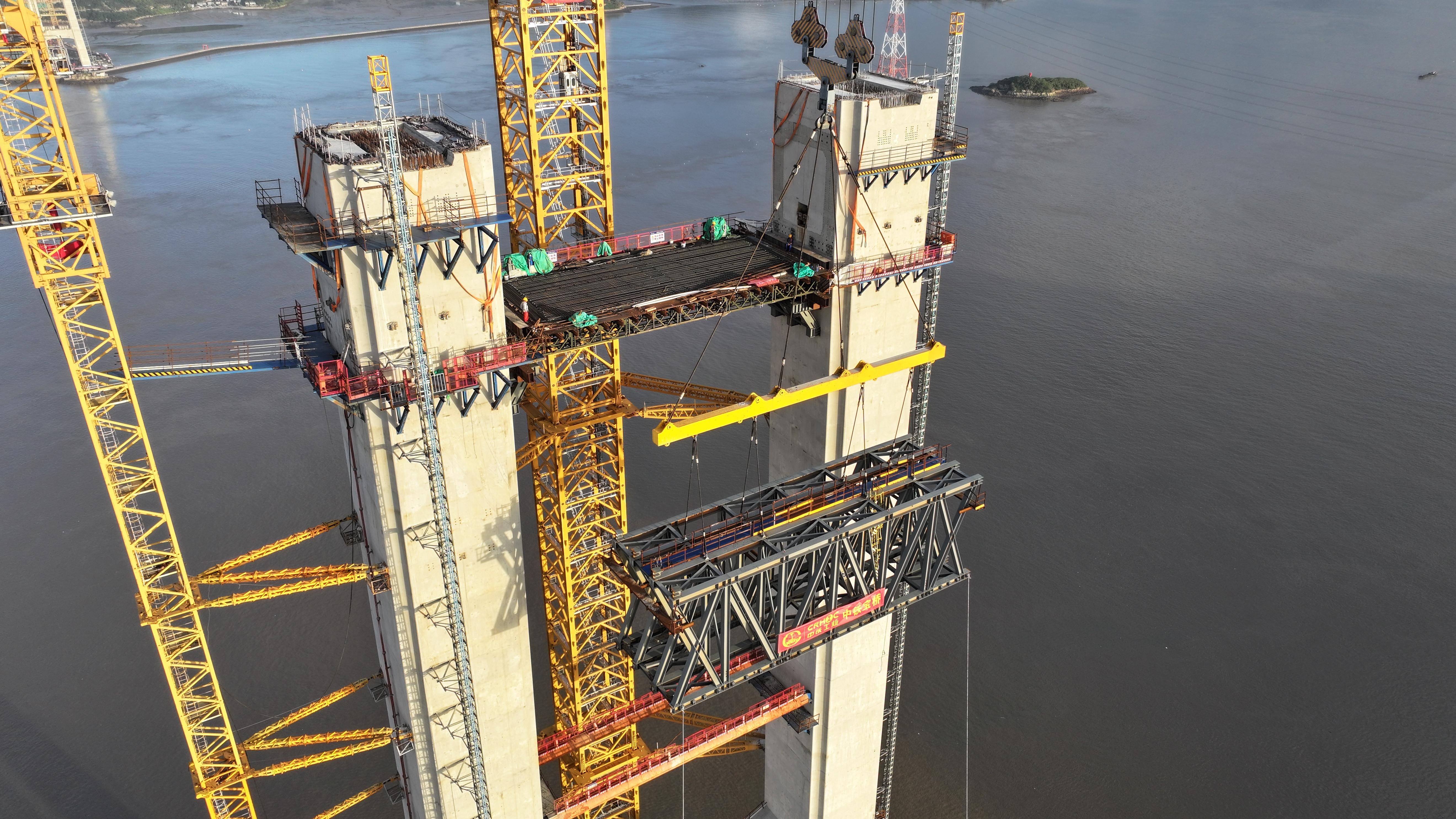 10月10日,在浙江宁波舟山港六横公路大桥二期工程建设现场,高达258.7米的双屿门大桥六横侧主塔之巅,最后一段重达180吨的横梁稳稳吊装就位,继9月6日完成封顶后,这座主跨达1768米的超级工程主塔,首次实现上横梁“云端合龙”,向全线贯通迈出关键一步。